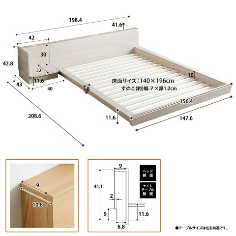 サイズ(約) ベッドフレーム:幅156.4×奥行208.6×高41.6cm床面サイズ:140×196cmナイトテーブル:幅42×奥行30×高42.8cm(※設置時の幅はフレーム幅とナイトテーブルの幅の合計となりますのでご注意ください) 材 質 ベッドフレーム:MDF( メラミン化粧繊維板 )、LVLナイトテーブル:MDF( メラミン化粧繊維板 ) 床面静止耐荷重(約) 150kg 組 立 お客様組立品(大人2人40分) 生産国 中国 梱 包 (個口数3:約)3-1)163×36×12.5(27kg) 3-2)104×34.5×11(10.8kg) 3-3)104×43.5×8(9kg)(cm) その他・注意事項 コンセントAC100V※組立にプラスドライバーが必要です。