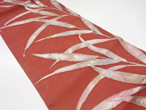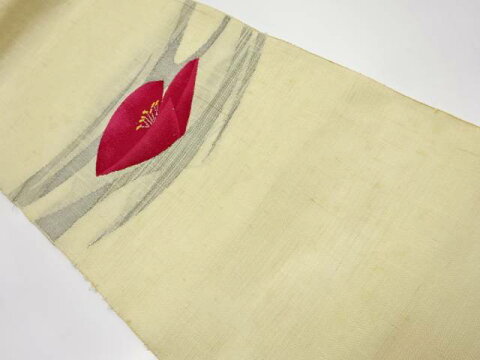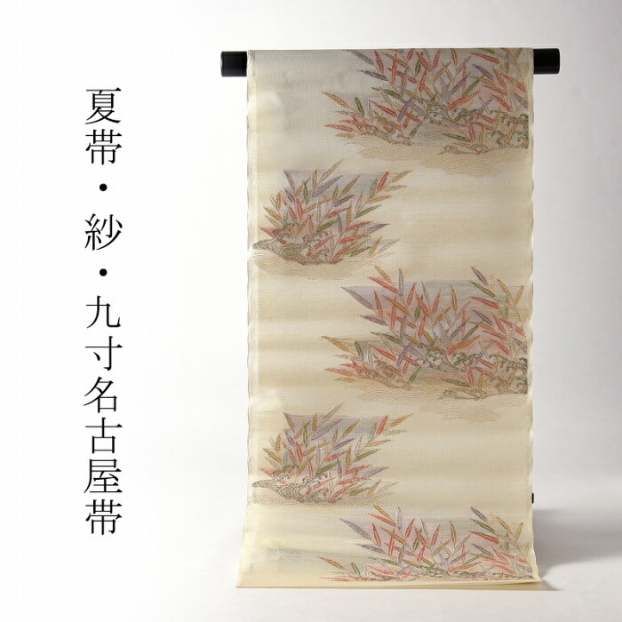 夏帯 お仕立て付き 正絹 紗 西陣「齋城織物」 織り帯 九寸名古屋帯(六通柄)生成り色 波に笹文様 セミフォーマル着用 送料無料