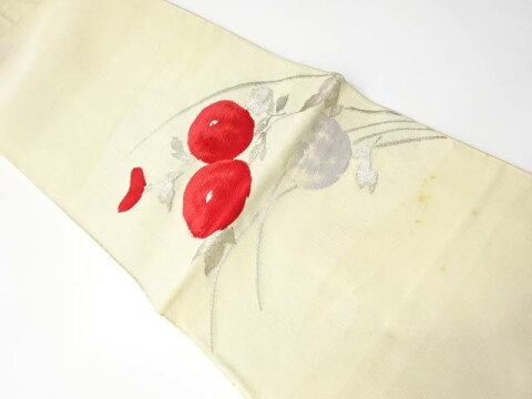 <名古屋帯サイズ>(単位:cm)太鼓部分長さ135太鼓部分幅30.5前部分長さ224前部分幅15 時代 現代(1989 - ) 状態 非常によい 素材 化繊 色目 オフホワイト 【商品説明】状態は大変良いです。